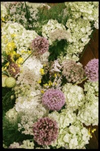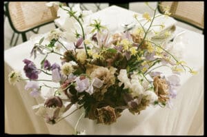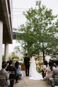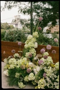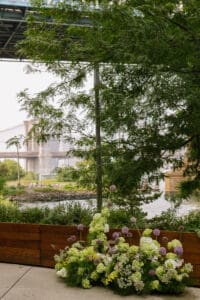 The ceremony took place in the courtyard at Celestines that overlooks the Manhattan bridge, creating a natural backdrop that needed little embellishment. They kept décor light and organic—playful colors whimsical florals by Jura Floral, and textures that complemented the airy feel of the space rather than competing with it.
